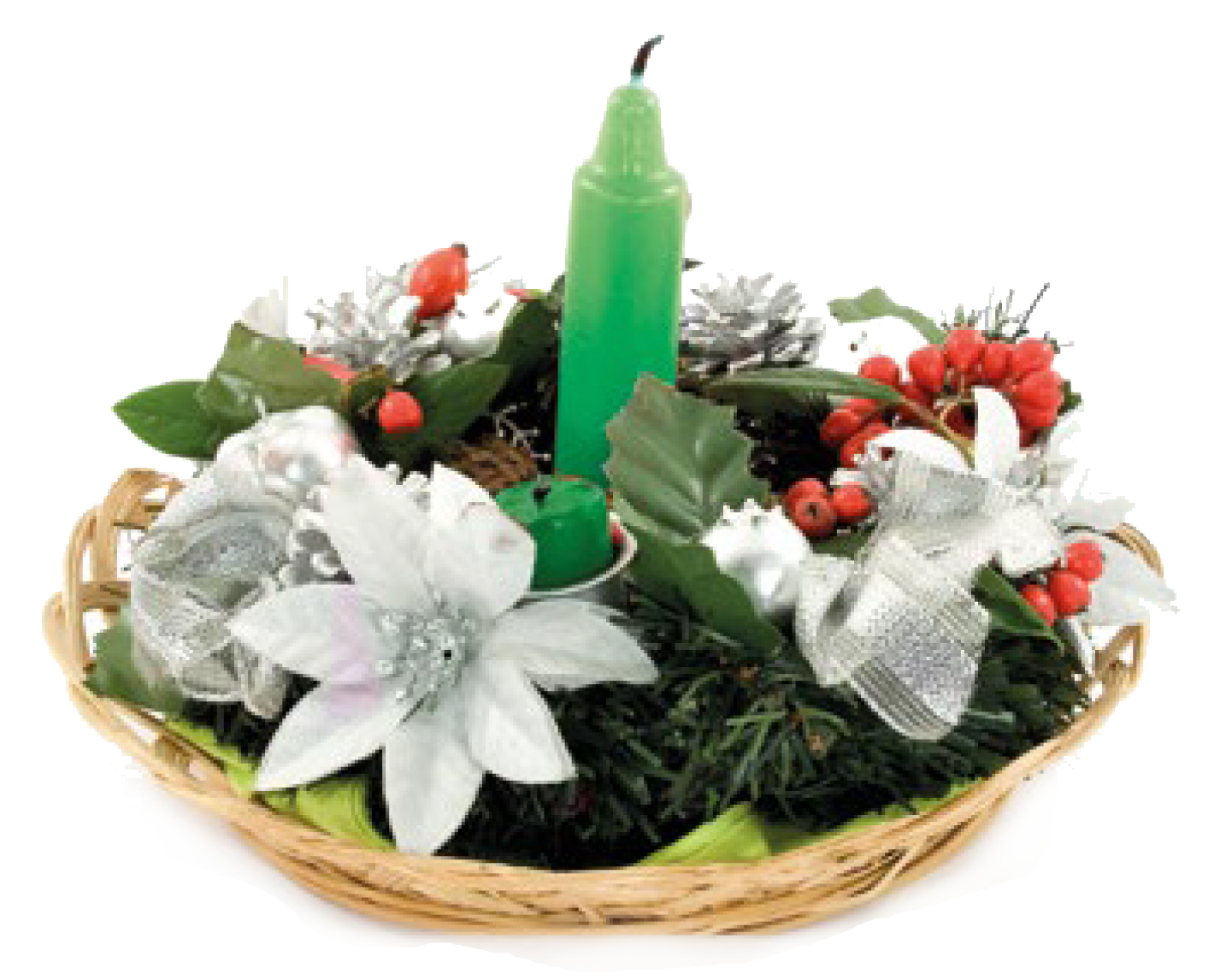 В плетеную корзинку удобного вам размера сложите хвойные ветки, елочные игрушки, бусы, фрукты или живые цветы. Можно ветки хвои скрепить в пучок проволокой и поместить по центру композиции. Чтобы хвоя сохранилась дольше, концы веток опустите в небольшой сосуд с подслащенной водой. В сервировке праздничного стола также используйте ветки хвои. Пучок веток обвяжите красной ленточкой и украсьте колокольчиком. Такие композиции раскладывают возле прибора каждого из гостей вместе с рождественскими открытками.