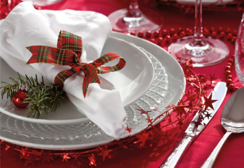 Элегантным и в то же время простым может стать вариант, сочетающий белокипенную накрахмаленную скатерть, такие же салфетки и зелень: хвойные веточки или любимую всеми пуансеттию – «Рождественскую звезду», в центре стола.