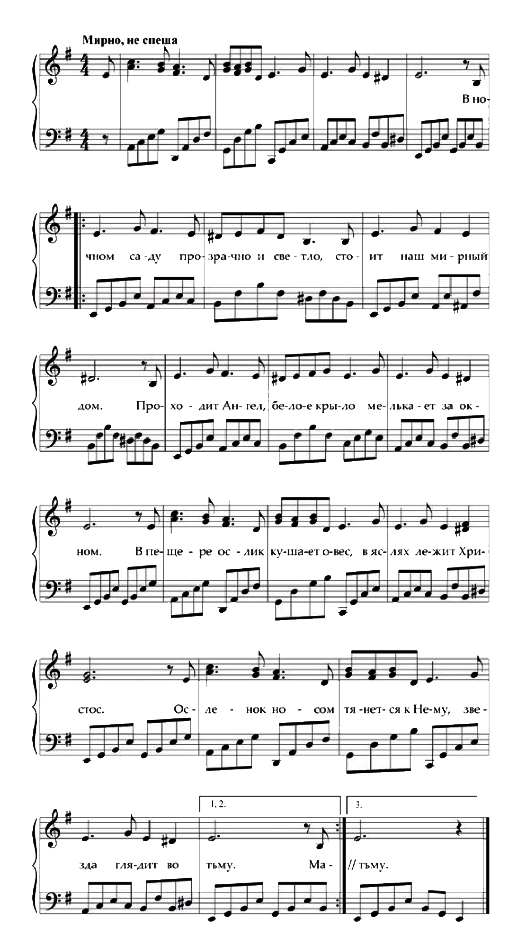 Предлагаем вашему вниманию рождественскую песенку с нотами, которую мы взяли из сборника «Рождественские песни и колядки». Эти песни, славящие Рождество Христово, поют на Святках ученики «Русской школы Марии Аверьяновой». Хор непрофессиональный, в нем дети разных возрастов и вокального уровня. Но поют дети с душой, потому что в эти рождественские дни сердца их переполняются радостью от чудного прихода в мир Младенца Христа. И каждый родитель сможет научить этим рождественским песенкам своих чад, независимо от их музыкальных способностей и уровня, ведь славить Рождество Спасителя мира – привилегия каждого.