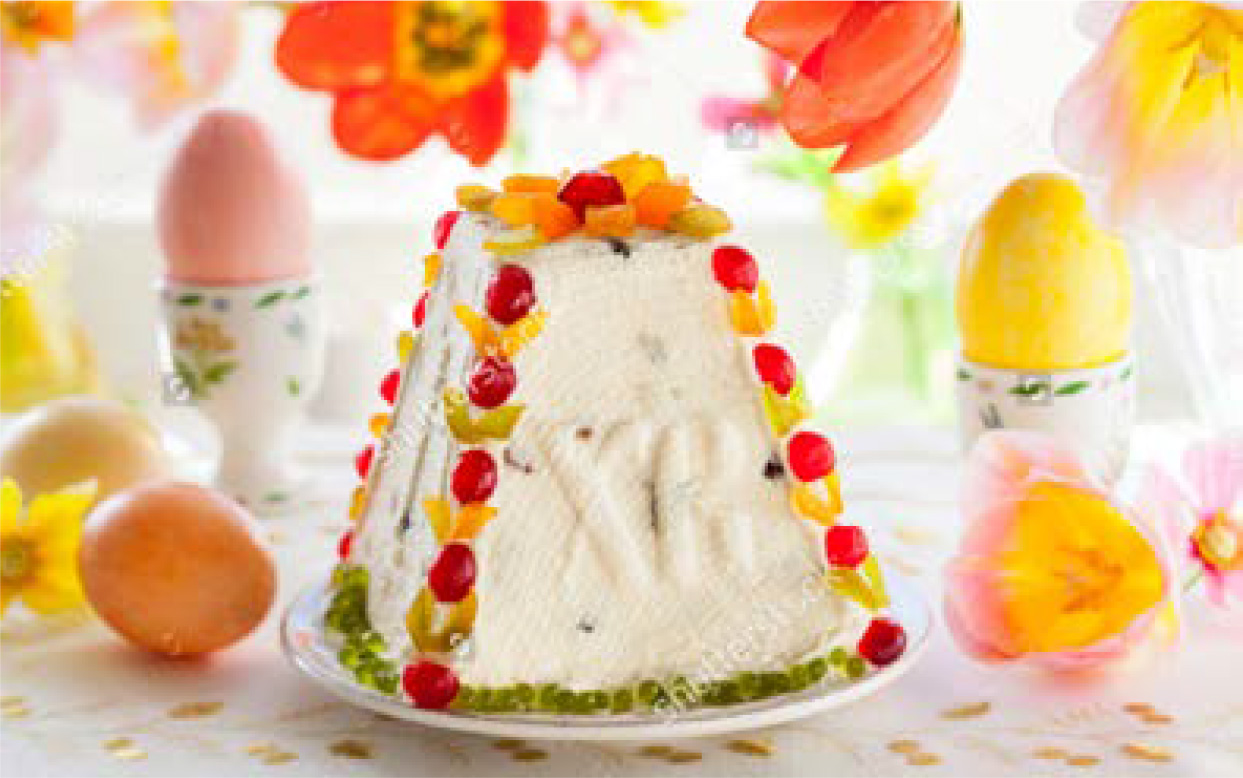 Угощение, несущее в себе глубокий смысл. Ее еще называют «млеко огустевшее», что значит «творог». В этом названии воплотилась мечта верующих о святых землях. В Книге Исхода Господь, призывая Моисея увести народ в Землю обетованную, называет ее «землей хорошей и пространной, где текут молоко и мед». Обещанная земля становится прообразом самого Царствия Небесного, а творожная пасха стала воплощением этой мечты, символом грядущей блаженной вечности, сладости этого бытия.