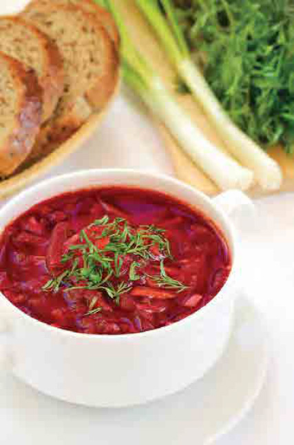 Для приготовления борща 5 штук крупной свеклы очистить, нашинковать. Большую сковороду смазать подсолнечным маслом, разогреть, положить свёклу, смочить ее тремя ложками столового уксуса (6-9%), поджарить, помешивая. Посыпать свёклу ложкой муки, размешать, поджарить еще, подливая по ложке бульона, сваренного из кореньев и овощей, пока свёкла не будет почти готова. Переложить ее в процеженный бульон и сварить до готовности. Подавая борщ к столу, всыпать зелень и 2-3 отваренных нашинкованных любых гриба.