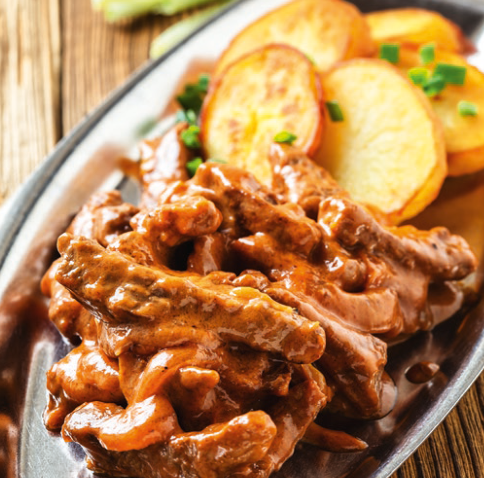 Несмотря на свое иностранное звучание, является исключительно русским блюдом. Готовится из мелко нарезанных кусочков говядины, залитых горячим сметанным соусом. А про происхождение этого блюда существует две байки… Позапрошлый век, Одесса. Повар-француз готовит мясо для графа Александра Григорьевича Строганова, лишившегося в старости зубов. И готовит весьма преаппетитно!