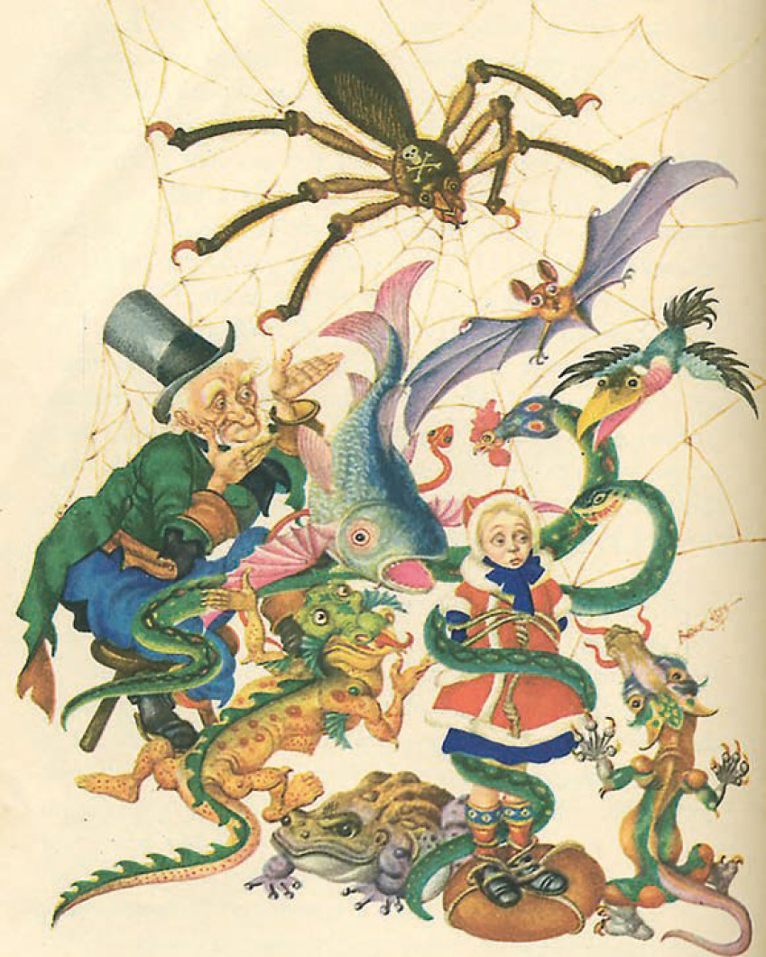 «Ну, на меня-то приятно и посмотреть! — думала Инге. — Я и сама хорошенькая и одета нарядно!» И она повела на себя глазами — шея у нее не ворочалась. Ах, как она выпачкалась в пивоварне болотницы! Об этом она и не подумала! Платье ее все сплошь было покрыто слизью, уж вцепился ей в волосы и хлопал ее по шее, а из каждой складки платья выглядывали жабы, лаявшие, точно жирные охрипшие моськи. Страсть, как было неприятно! «Ну, да и другието здесь выглядят не лучше моего!» — утешала себя Инге.