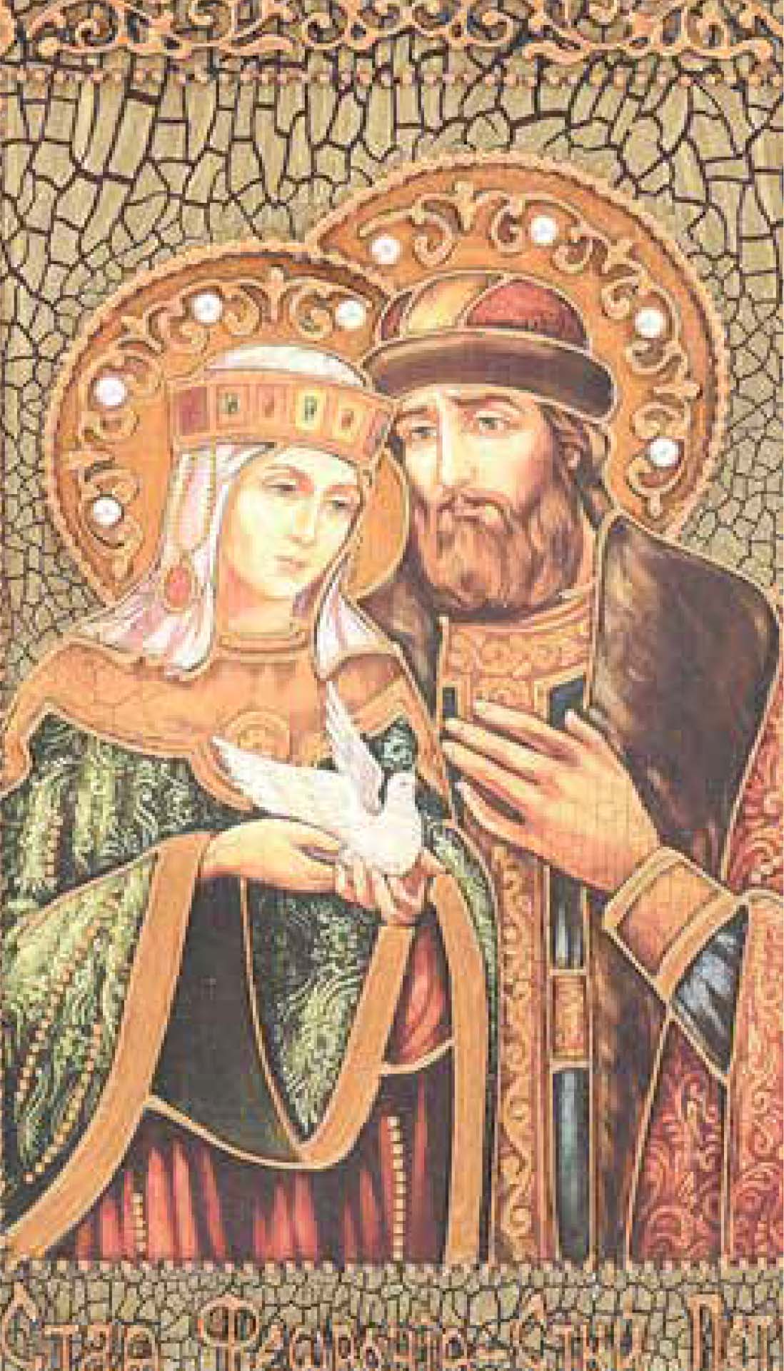 Удивительным образом свела судьба муромского князя Петра и Февронию, дочь рязанского пчеловода. Петр, заболев тяжким недугом, отправился на поиски лекаря в Рязанские земли. Там он встретил Февронию, и она согласилась исцелить князя при условии, что тот станет ее мужем. Так и случилось. За свою земную жизнь святая чета показала невероятную преданность друг другу. Все радости и невзгоды они привыкли делить пополам. «Двое – одна плоть». Даже когда муромские бояре взбунтовались против княжны-простолюдинки и потребовали у князя отказа от престола, Петр не оставил Февронию и вместе с ней покинул город. Вскоре после их ухода начались распри и смута, сам народ попросил князя вернуться и занять место законного правителя.