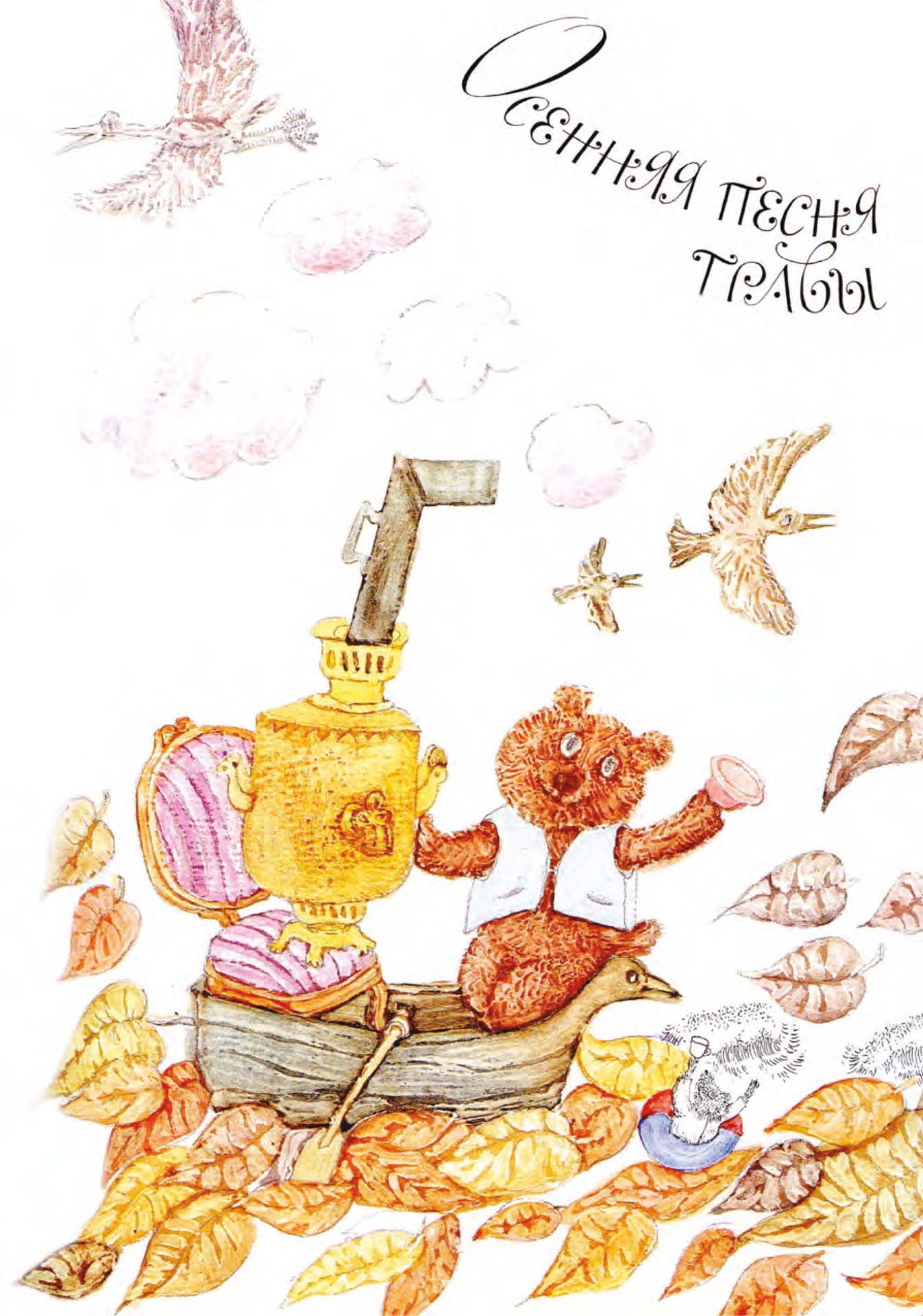 А травинки поднялись во весь рост и запели громкими голосами. Пел весь луг над рекой. И последний лист, что трепетал на том берегу, стал подтягивать. И сосновые иголки, и еловые шишки, и даже паутина, забытая пауком, — все распрямились, заулыбались и затянули изо всех сил последнюю осеннюю песню травы.