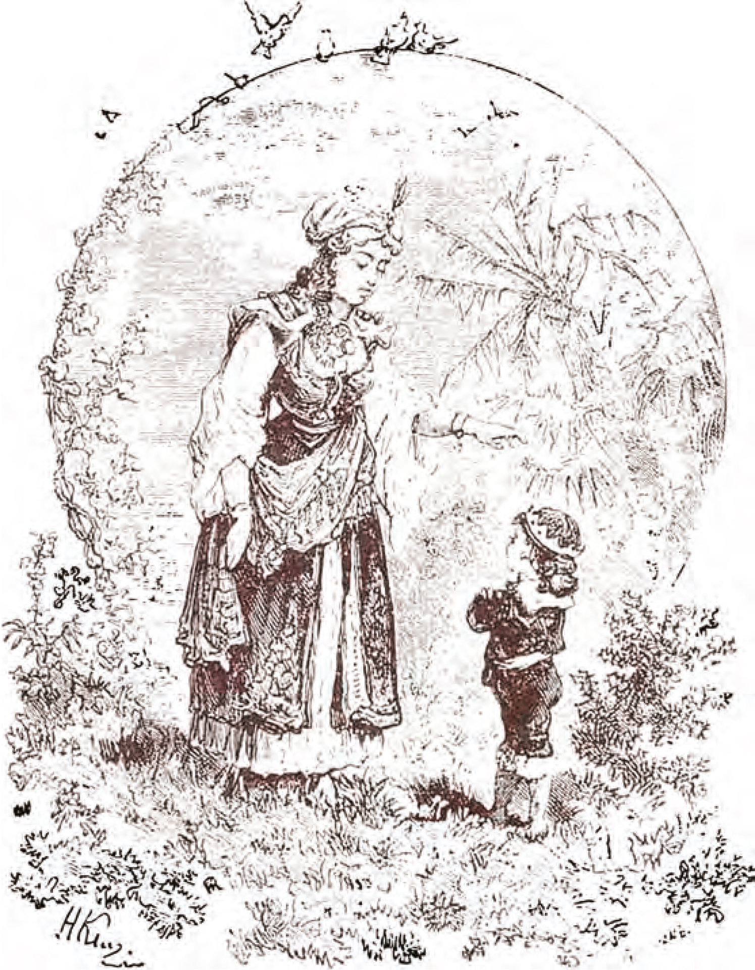 Тут стояли вызолоченные роспуски, бархатом обитые; нищий сел на роспуски и ускакал с Царевичем в степь. Няни, как добежали до ворот, не нашли уже ни нищего, ни дитяти, ни следа их не видали, да и дороги тут не было, где Хан с горы спустился.