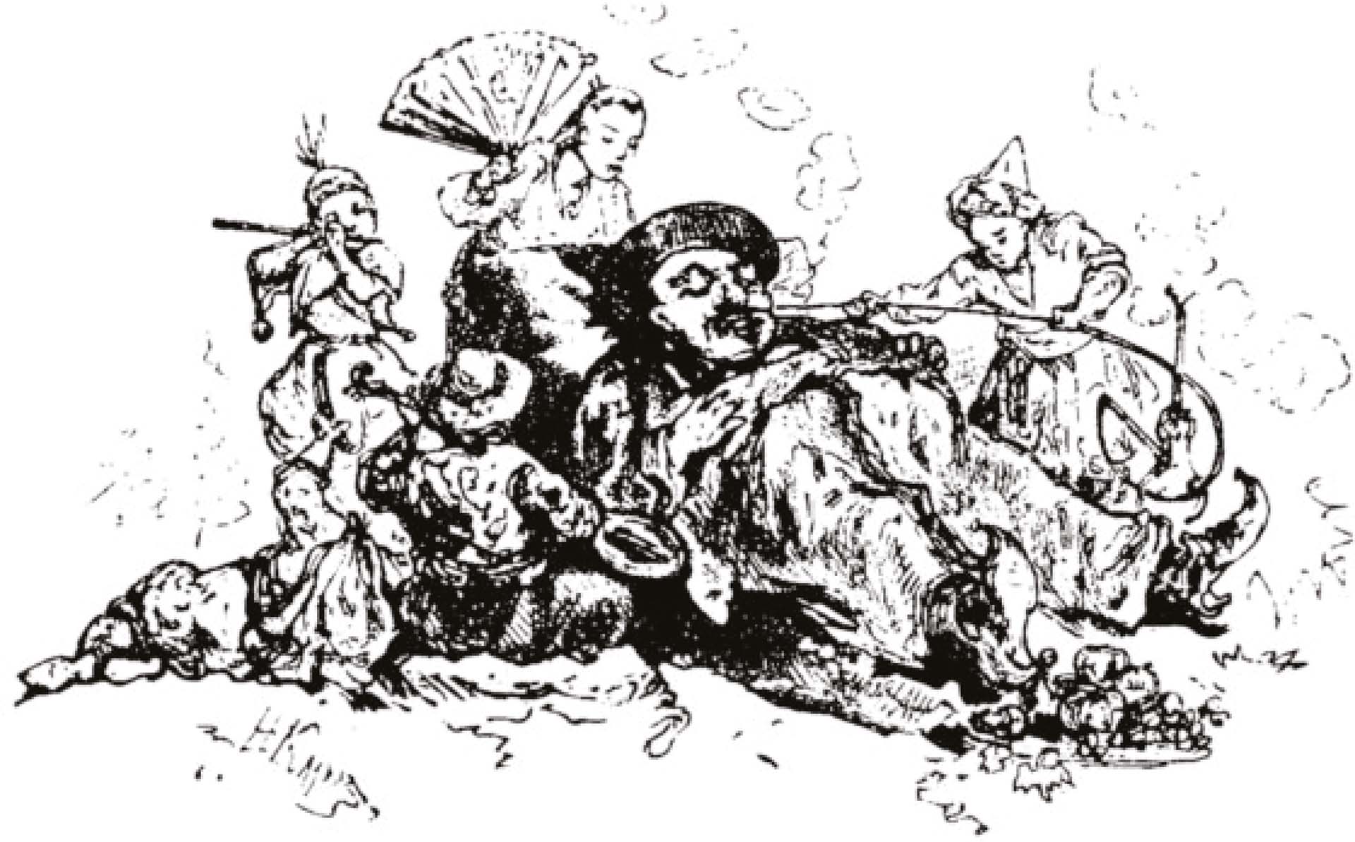 Отошед подалее, нашли ЛеньтягаМурзу, главного надзирателя того места, который прогуливался со своими домашними. Увидя Хлора с провожатым, принял их с ласкою и просил зайти в его избу; они, устав маленько, пошли к нему. Вошед в его горницу, он посадил их на диван, сам же лег возле них посредь пуховых подушек, покрытых старинною парчою, его же домашние сели около стены; потом Леньтяг-Мурза приказал принести трубки курительные и кофе. Услыша же от них, что табаку не курят, кофе не пьют, благовонными духами опрыскивать ковры велел, после чего спросил Хлора о причине его прихода в зверинец. Царевич ответствовал, что по приказанию Хана он ищет розу без шипов, которая не колется. Леньтяг-Мурза дивился, что в таких молодых летах предпринял такой труд, говоря, что и старее тебя едва ли станет: «Отдохните, не ходите далее; у меня здесь есть люди, кои находить старались, но, устав, покинули». Один из тут сидящих встал с места и сказал: «Я сам неоднократно хотел дойти, но скучил, а вместо того я остался жить у моего благодетеля Леньтяг-Мурзы, который меня поит и кормит». Между сих разговоров Леньтяг-Мурза уткнул голову в подушку и заснул. Как около стены сидящие услышали, что Леньтяг-Мурза храпит, то они полегоньку встали: иные пошли убираться и украшаться, иные легли спать, иные начали всякие празднословия говорить, иные ухватились за карты и кости, и при всех сих упражнениях иные сердились, иные радовались, и на лицах всех разные их внутренние движения оказывались. Как ЛеньтягМурза проснулся, все паки собрались около него ж внесли в горницу стол с фруктами. Леньтяг-Мурза остался посреди пуховых подушек и оттудова потчевал Царевича, который весьма прилежно примечал все, что тамо ни делалось. Хлор лишь принялся было отведать предлагаемое им от Леньтяг-Мурзы, как его проводник Рассудок его за руку дернул полегоньку. Кисть прекрасного винограда, которую Царевич в руках держал, по полу рассыпалась, он же, опомнясь, тотчас встал, и оба вышли из хором Леньтяг-Мурзы.